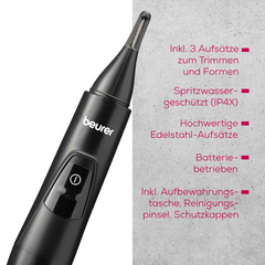 Mit dem MN2X Präzisionstrimmer von Beurer mit hochwertigen Aufsätzen aus Edelstahl trimmst du deine Haare einfach und unkompliziert. Mithilfe der 3 verschiedenen Aufsätze bringst du deine Augenbrauen, Nasen- und Ohrhaare perfekt in Form - dank praktischer Aufbewahrungstasche auch unterwegs!