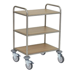 Vielseitiger Edelstahlwagen mit 3 melaminharzbeschichteten Böden in Novocal-F Farbe.