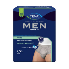 Mit den TENA Men Active Fit Pants Normal kannst du mittelstarkem Harnverlust aktiv entgegentreten und dabei die volle Kontrolle behalten. Diese komfortablen, grauen Pants bieten das Gefühl und den Look normaler Unterwäsche, kombiniert mit einem maskulinen Schnitt und einem elastischen Taillenbund, der für eine diskrete und sichere Passform sorgt. Das atmungsaktive Material trägt zu einem angenehmen Tragegefühl bei, welches den ganzen Tag anhält.